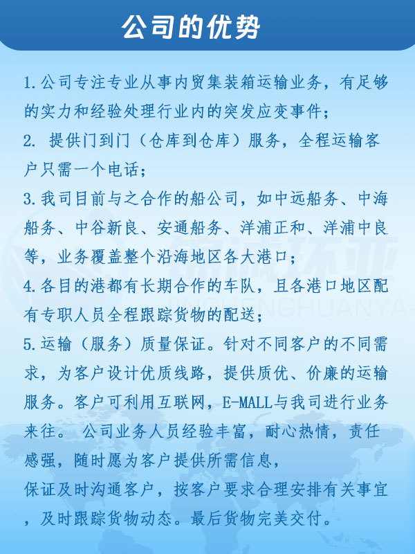 4.運輸廣闊:班輪航線可達國內(nèi)各沿??诎都皟?nèi)河港口,并配送至周邊省市;